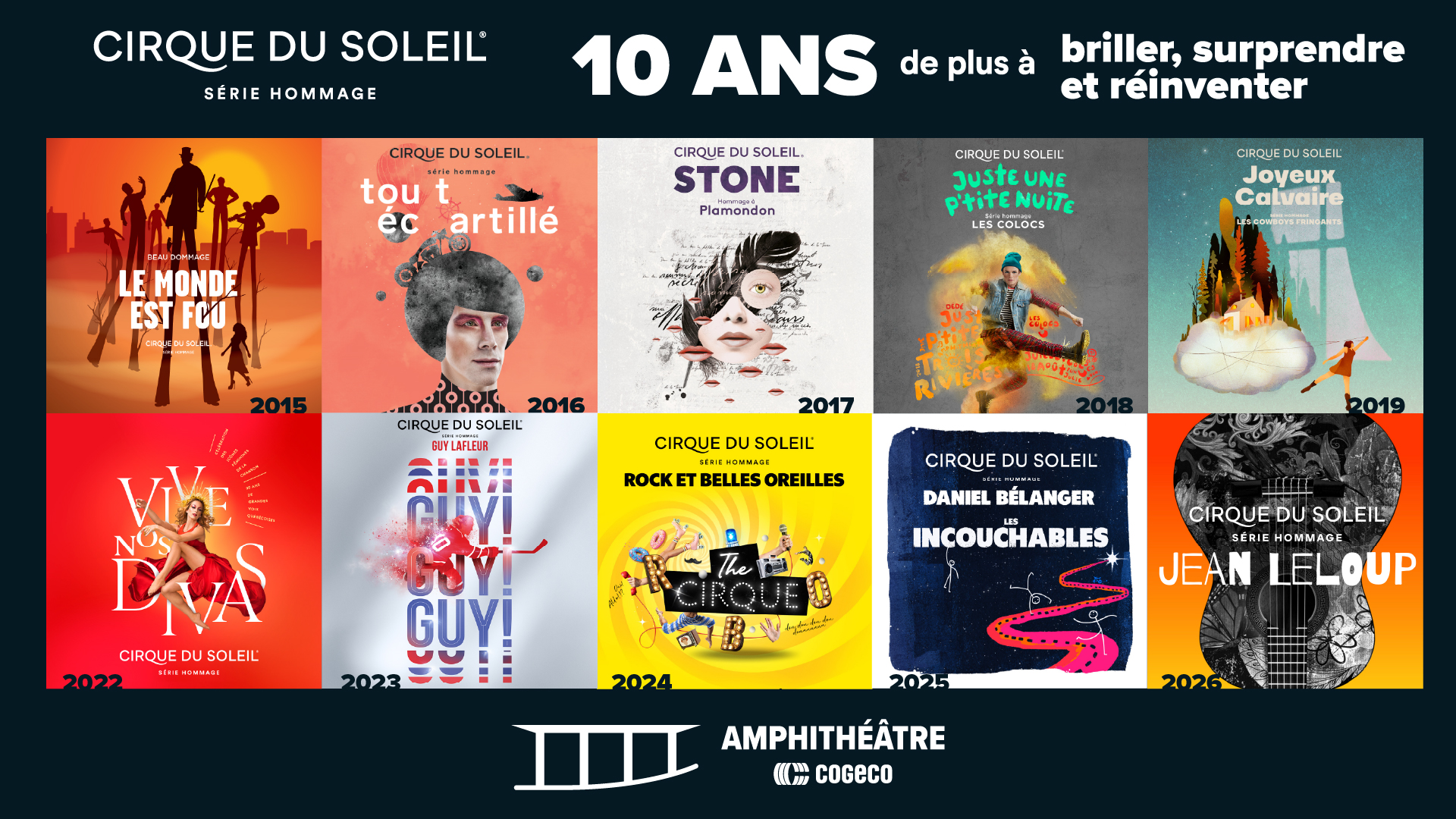 Depuis 2015, l’Amphithéâtre Cogeco de Trois-Rivières reçoit, en exclusivité, le Cirque du Soleil pour présenter une création originale de sa Série hommage, un concept audacieux qui revisite des figures et des œuvres marquantes de la culture québécoise à travers le langage artistique et spectaculaire du cirque. De la musique à l’humour, du sport à la poésie, cette série est devenue au fil des ans une véritable tradition estivale, attendue autant par les passionnés de cirque que par les amateurs de culture québécoise.